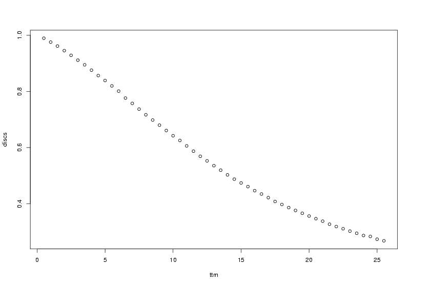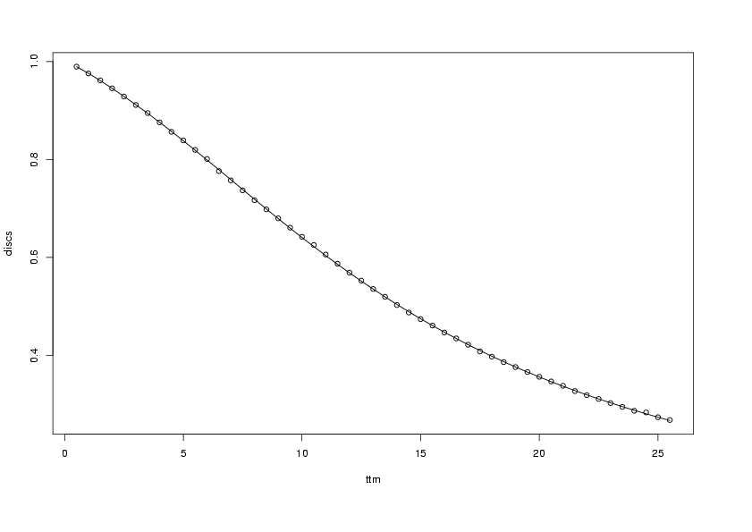 2. Next, create a corresponding time-to-maturity variable with values ttm= 0.5, 1.0, 1.5, ... 25.5. Create a scatter plot of discount factors as a function of time-to-maturity to confirm that the data make sense.