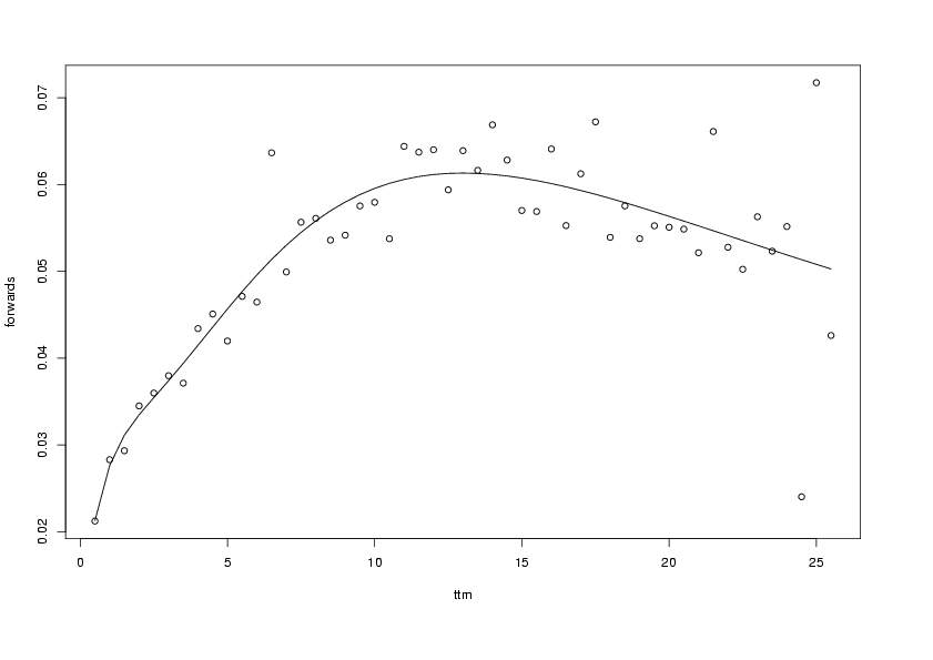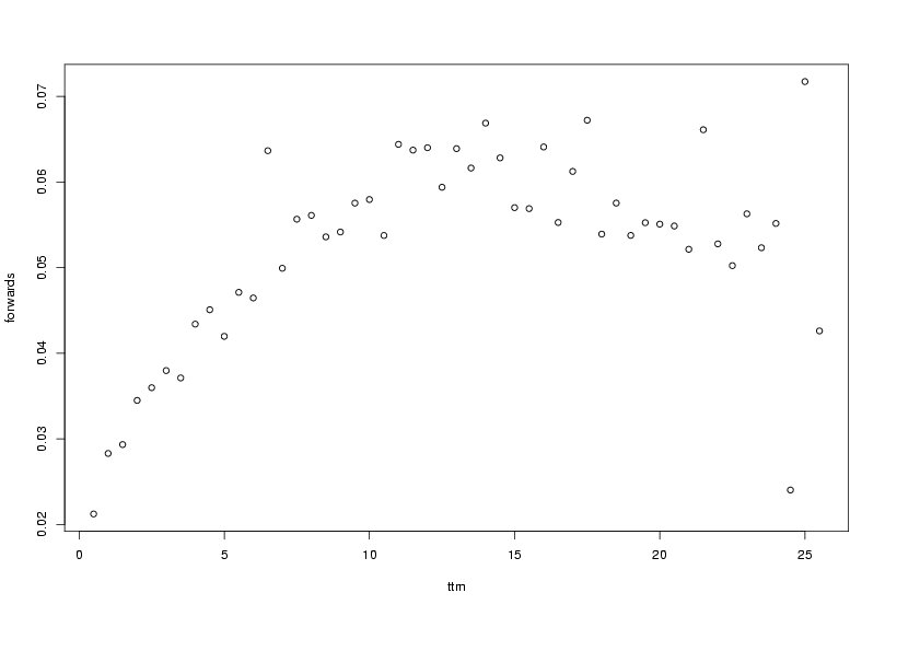 6. Plot raw implied forward rates and the fitted values (forwardfitted(0,t) = (discfitted(0,t-1/2)/discfitted(0,t) -1)*2) to the original values. Most practitioners feel that the sort of fitted values we obtain give a more accurate picture of the market than the unsmoothed numbers.