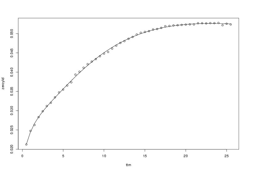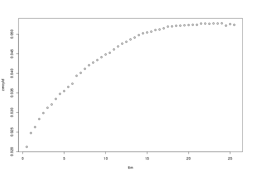 Note: We thought about using LIBOR rates for the example, but that is a bit complicated because long maturities LIBOR rates seem to have swap prices (from which bond prices might be inferred) but no pure-discount bonds. Using the STRIP prices is more straightforward.